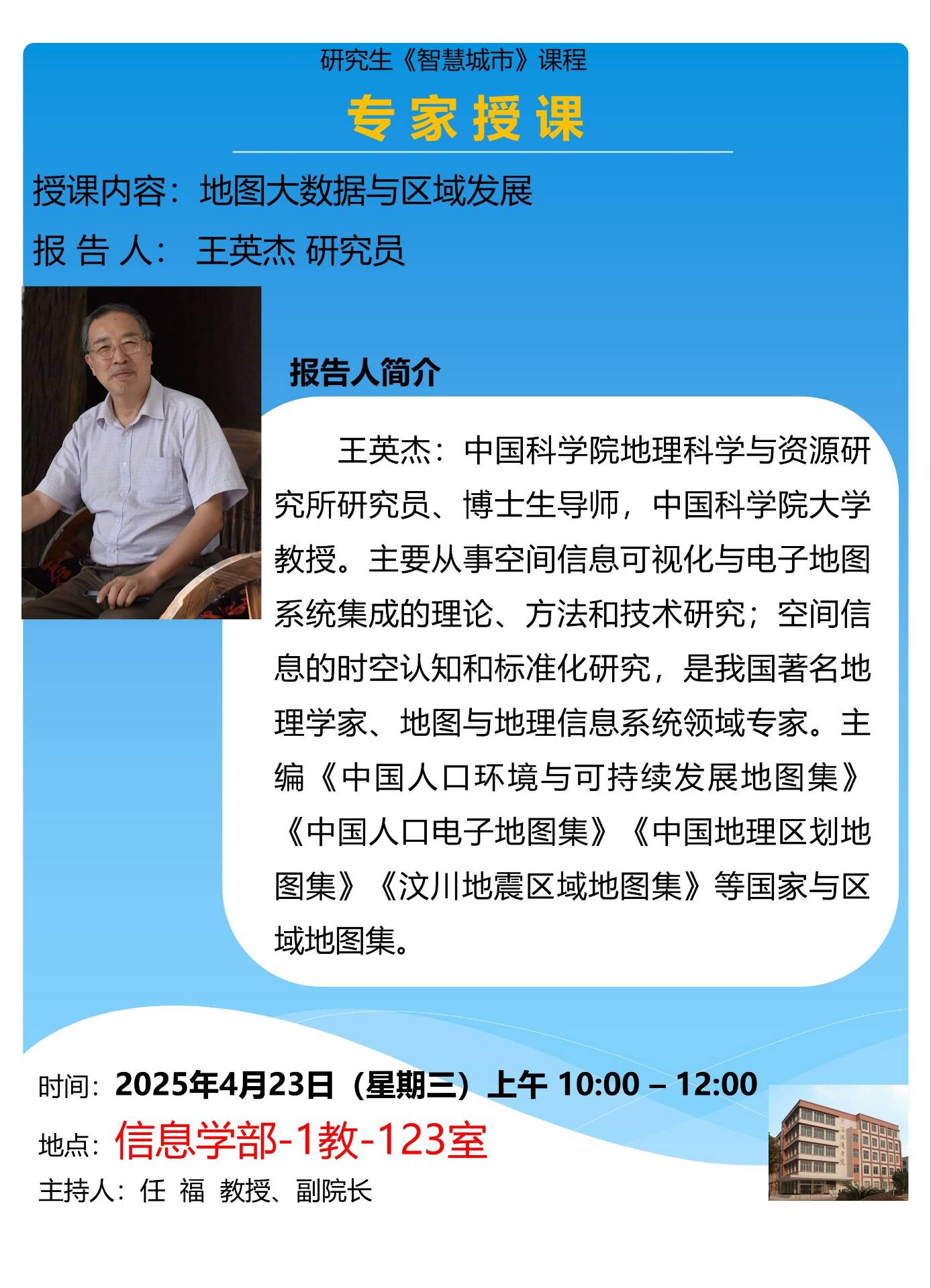 2025年4月23日上午,学院任福教授主讲的研究生《智慧城市》课程持续深化科教协同创新,特别邀请中国科学院地理科学与资源研究所王英杰研究员走进课堂,以“地图大数据与区域发展”为题,为师生呈现了一场兼具理论深度与实践前瞻的学术专题讲座。