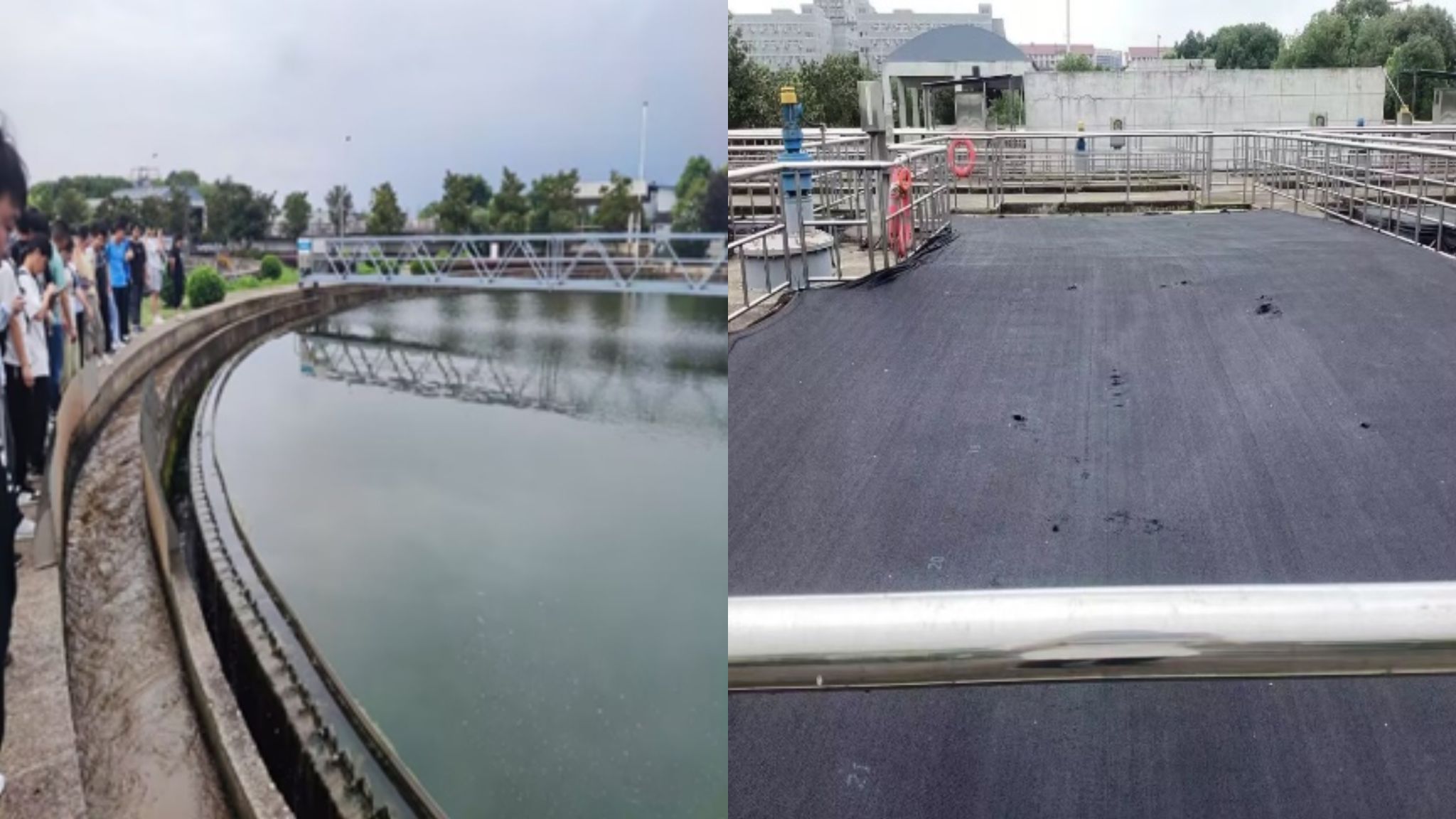 在二沉池后设有高效澄清池。由于水体并未处理完全,水中仍存在可溶性和极小微生物,其进行光合作用生成有机物并污染水体。因此,厂员用黑布罩住池面,使得水中的微生物无法进行光合作用,进而控制污水有机物的含量。