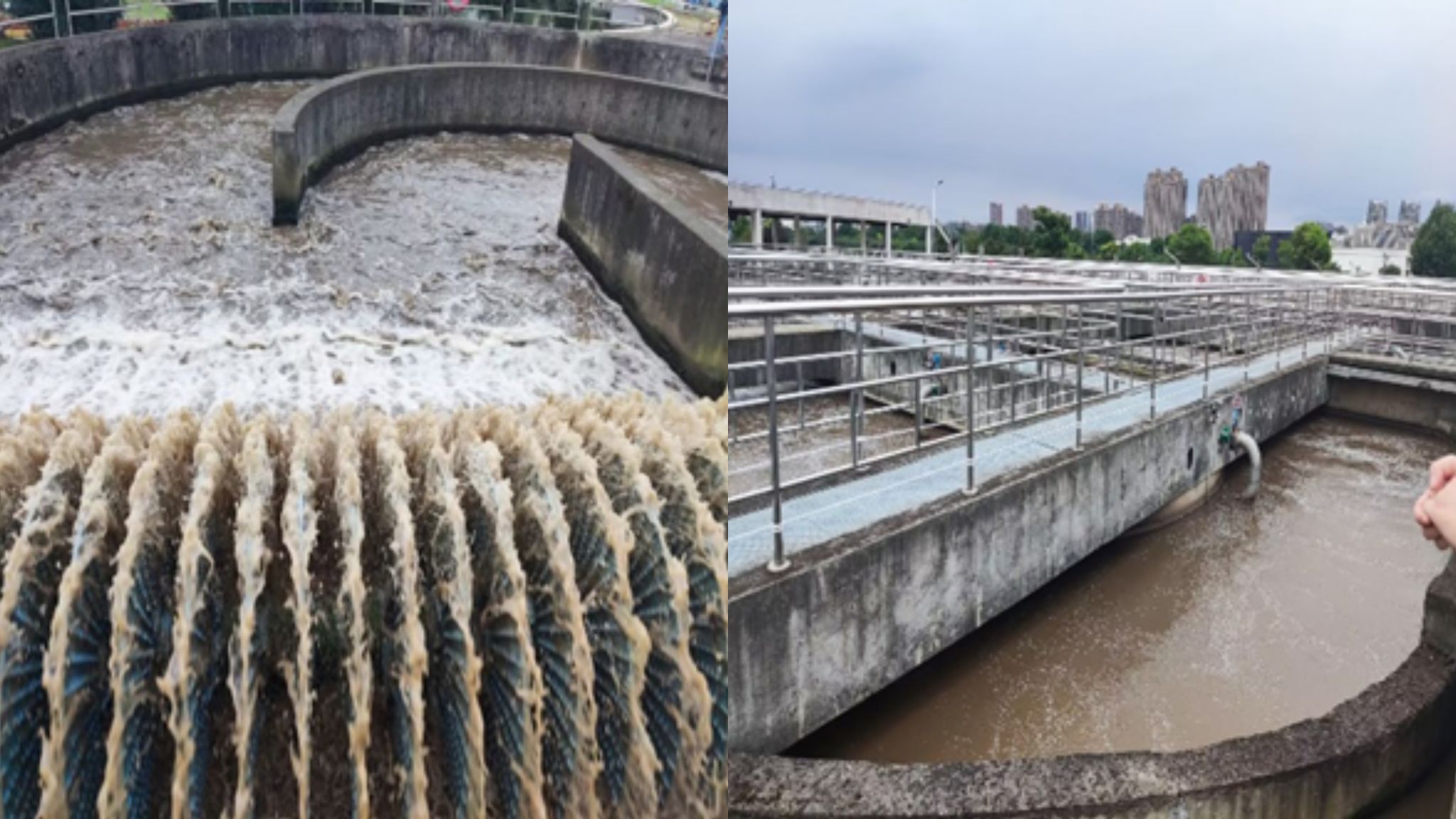 汤逊湖污水处理厂的二级处理由DE氧化沟、A2/O生物池、二沉池和澄清池组成。DE氧化沟由两个相同大小的氧化沟和一个沉淀池组成。该系统通过切换进出水及调节曝气转碟转速在沟中实现硝化—反硝化—硝化的流程,在去除BOD5的同时实现生物脱氮。滚轮状的推进器高速运转使得氧化沟中的污水与氧气充分接触,从而达到曝气氧化的效果,实现污水中有机物的氧化和降解。
