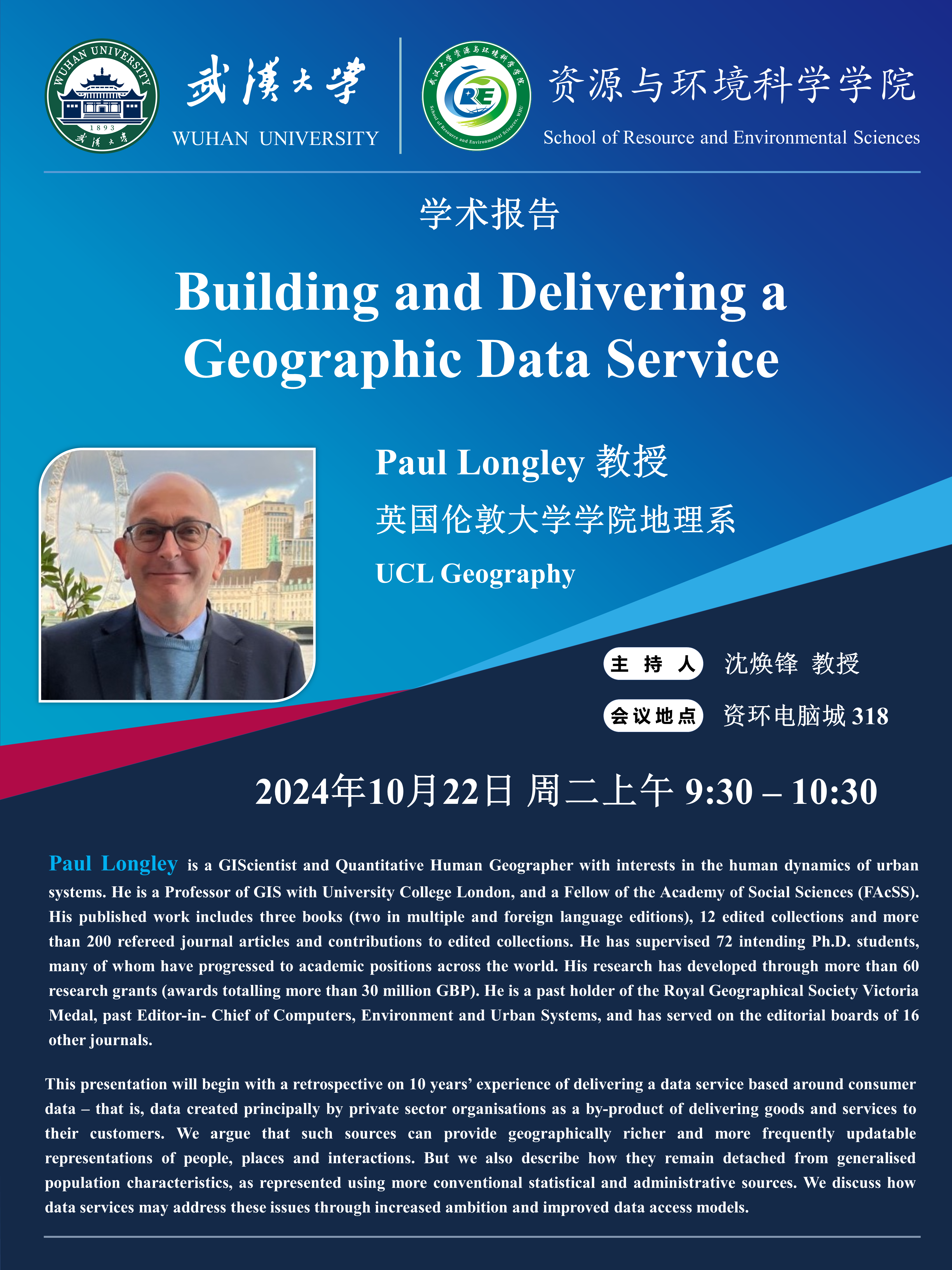 【学术讲座】10月22日 英国伦敦大学Paul Longley教授 Buiding and Delivering a Geographic Data Service