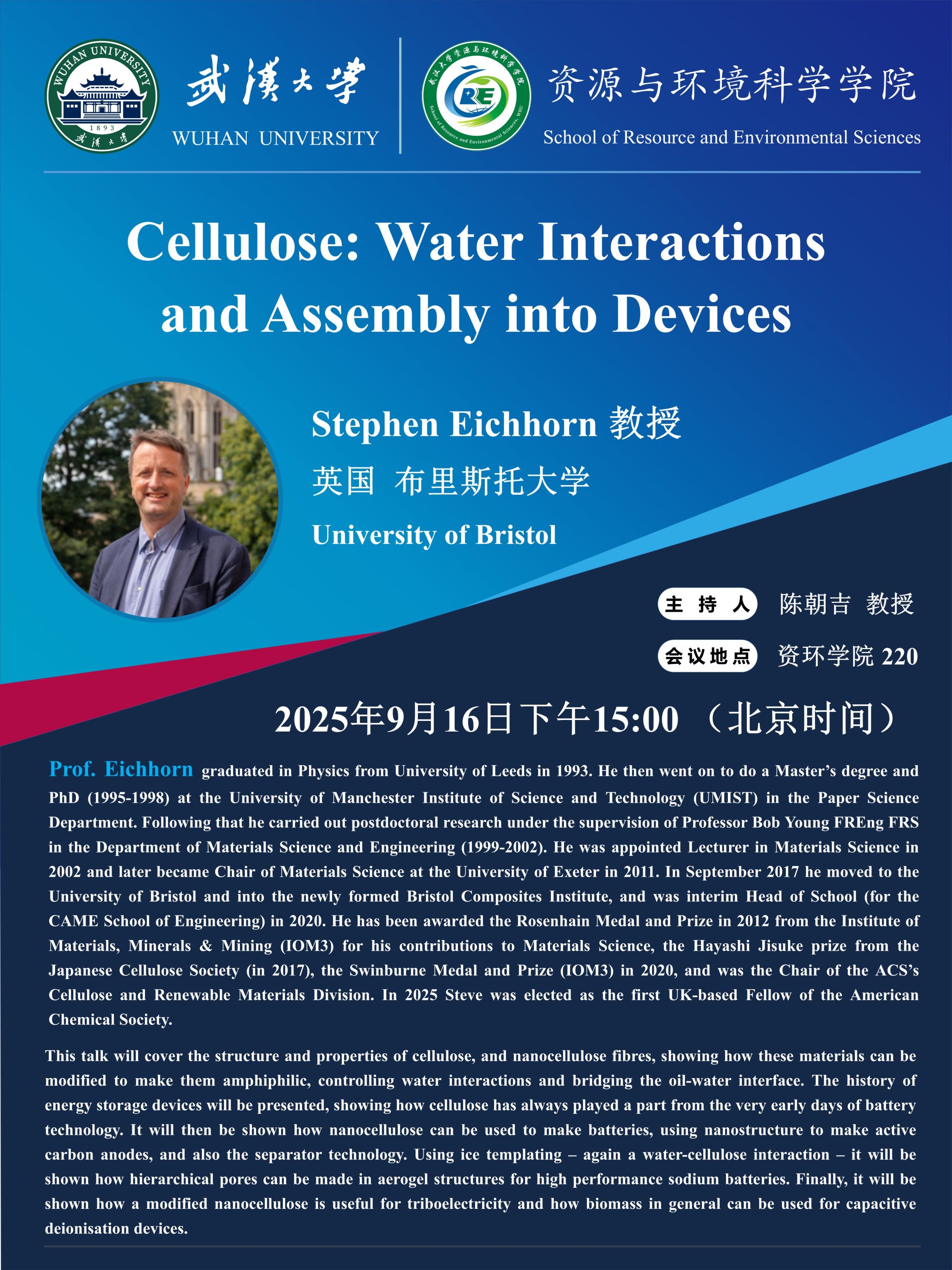 【学术讲座】9月16日下午 Stephen Eichhorn教授 Cellulose:Water Interactionsand Assembly into Devices