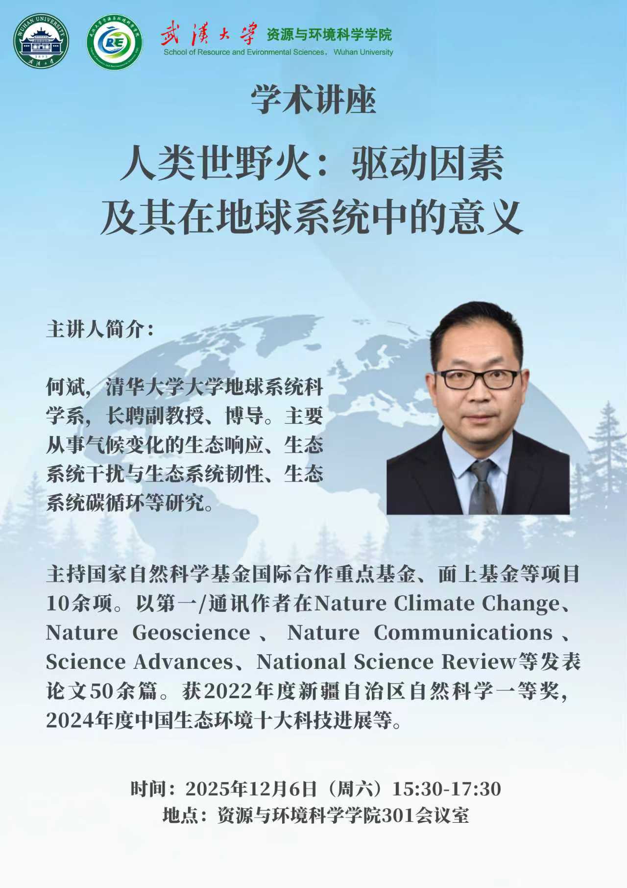 【学术讲座】12月6日下午 清华大学何斌 副教授 人类世野火:驱动因素及其在地球系统中的意义