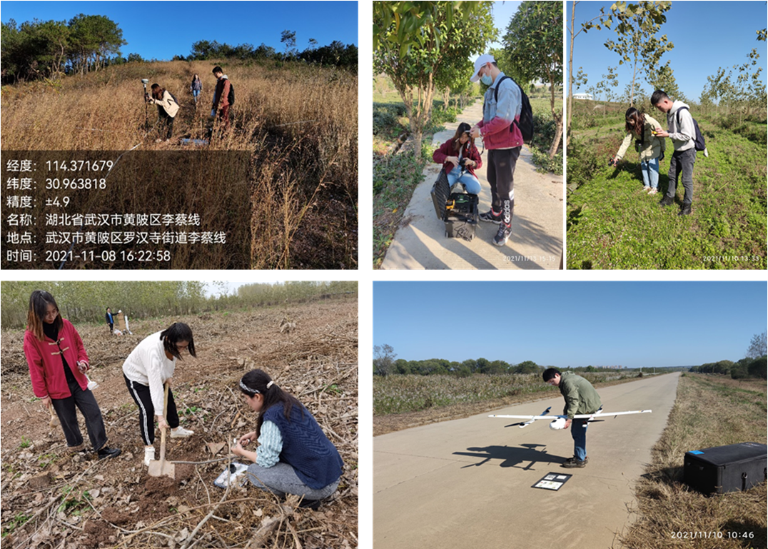 在武汉市天兴洲、黄陂区郊区林地、农田及城市公园选择典型样地,利用地物光谱仪、双通道热电偶温度计、手持式测温仪、区域土壤水分测量系统及土壤温湿度传感器进行土壤实地测量;利用叶面积指数仪、激光测高仪及胸径尺等便携设备,采集近端光谱、叶面积指数、胸径、树高等植被生态参数观测。在卫星同步区域执行无人机监测飞行任务,采集分米级航空RGB和多光谱、热红外数据,获取城市星-机-地多尺度土壤、生态监测结果。