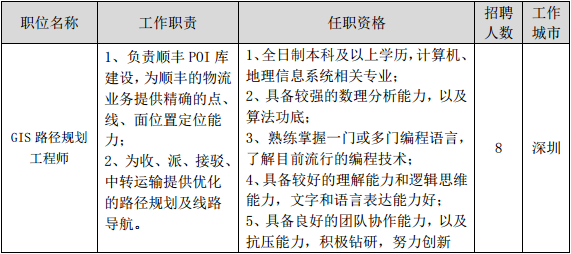 此外,热招机器学习与人工智能工程师、数据运营与分析工程师、视觉算法工程师、产品经理、测试工程师、分布式系统研发工程师、人力资源等岗位。更多岗位详细信息详见://campus.sf-tech.com.cn/campusRecruitment/Jobs.html
