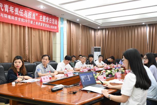 土地资源管理专业2017级硕士研究生党支部召开“新时代青年责任与担当”主题党日活动。副校长舒红兵院士,学院党委书记刘兴国,副书记雷起宏、冯丹,研究生辅导员梅菲老师等受邀出席。
