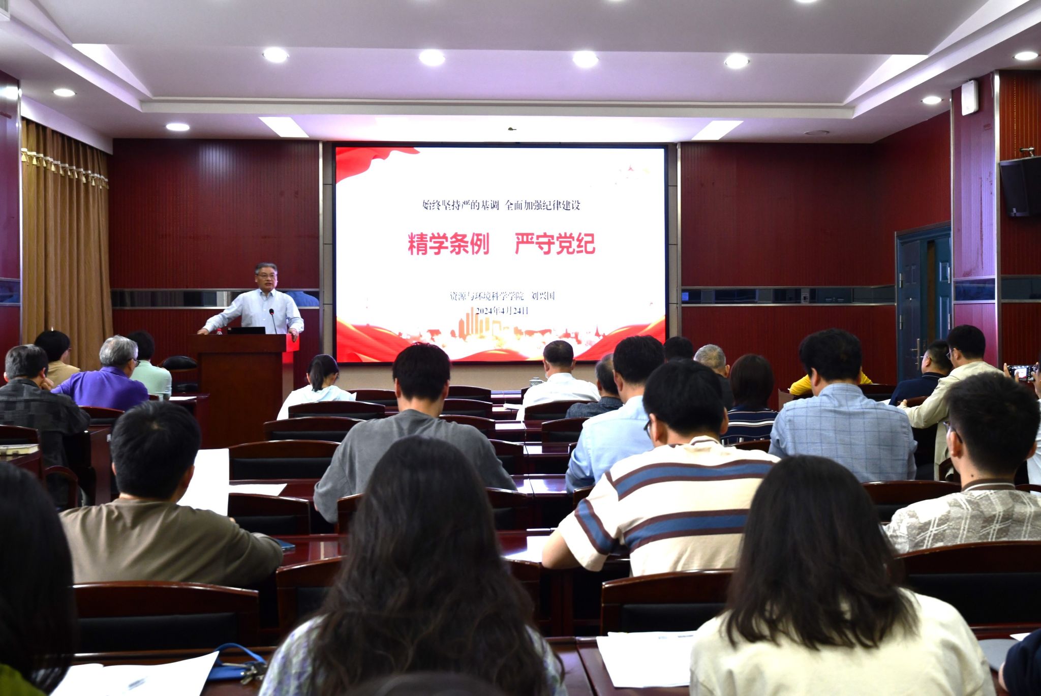 院党委书记刘兴国以“精学条例,严守党纪”为题讲了纪律专题党课,强调要深刻认识开展党纪学习教育的重大意义,对《中国共产党纪律处分条例》的修订历程和主要内容进行了宣讲,对学院开展党纪学习教育作了动员并提出了要求。