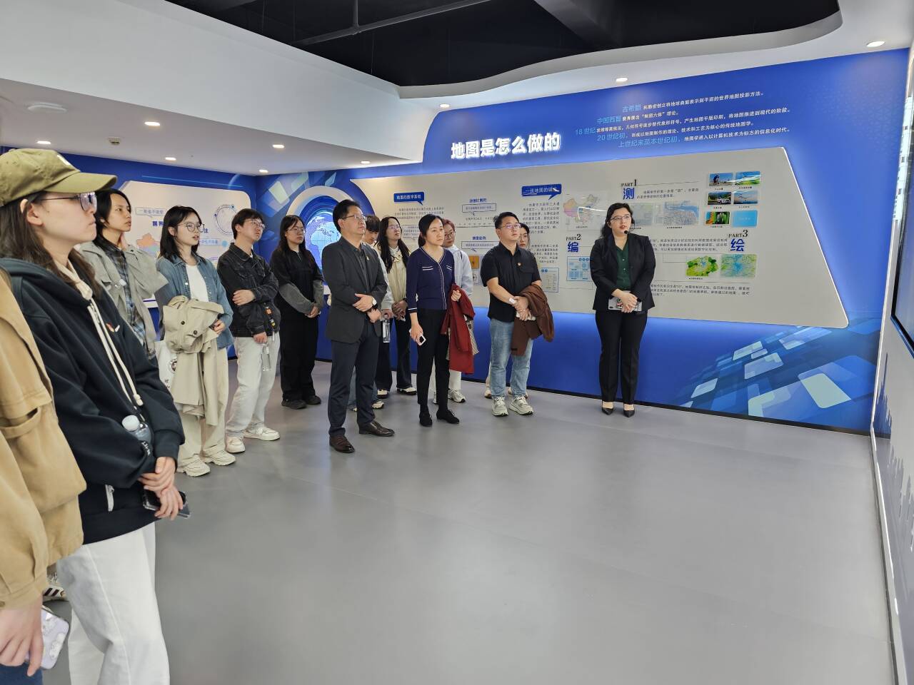 活动中,湖北省地图院党委委员肖晓、办公室主任谭竞漪、业务骨干张海静博士等热情接待了学院师生,张海静博士全程担任专业讲解,为学院师生带来了一场生动的实践教学课程。