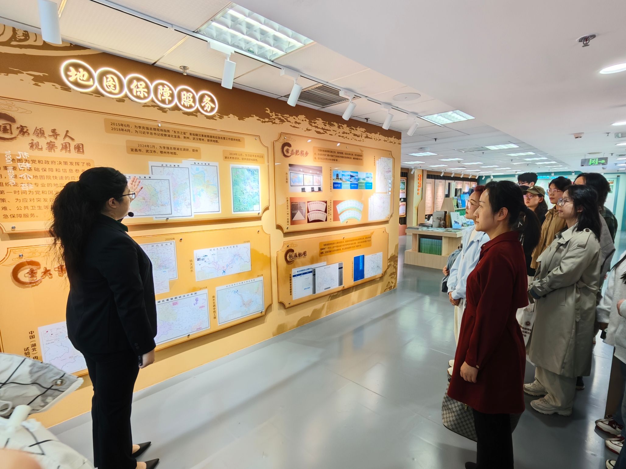 “地图科技3号厅”系统展示了地图制作的数字化流程与前沿技术。张海静博士特别强调:“地图中的一点一线,事关国家的主权、安全与利益。”这一警示让同学们深刻意识到严谨治学与严守法规的重要性。展厅内,“俯瞰中国”“地图上的湖北”等主题视频从宏观视角剖析湖北的战略地位与资源禀赋,进一步拓宽了学术视野。