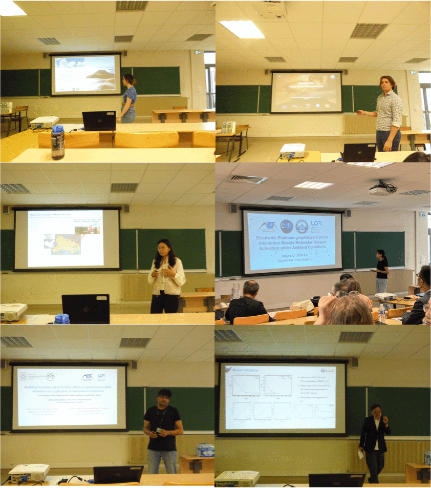 本次研讨会持续两天,与会双方分别介绍并探讨了团队的主要研究方向和工作进展,分别由和Gilles MAILHOT教授和吴峰教授主持。7月2日上午开幕式后9:30-12:00,法方Laurent DEGUILLAUME博士、Pauline NIBERT博士、Lucas PAILLER博士、Yi WU博士、李晓晓副教授汇报大气物理和新粒子生长的相关工作,下午14时至17时,刘欣怡、Peng CHENG博士、Hao WANG博士、Sridhar GOWRI SANKARAN博士、Yongrong ZOU博士、Tao LUO博士、吴峰教授汇报水环境和无机材料等领域相关工作。