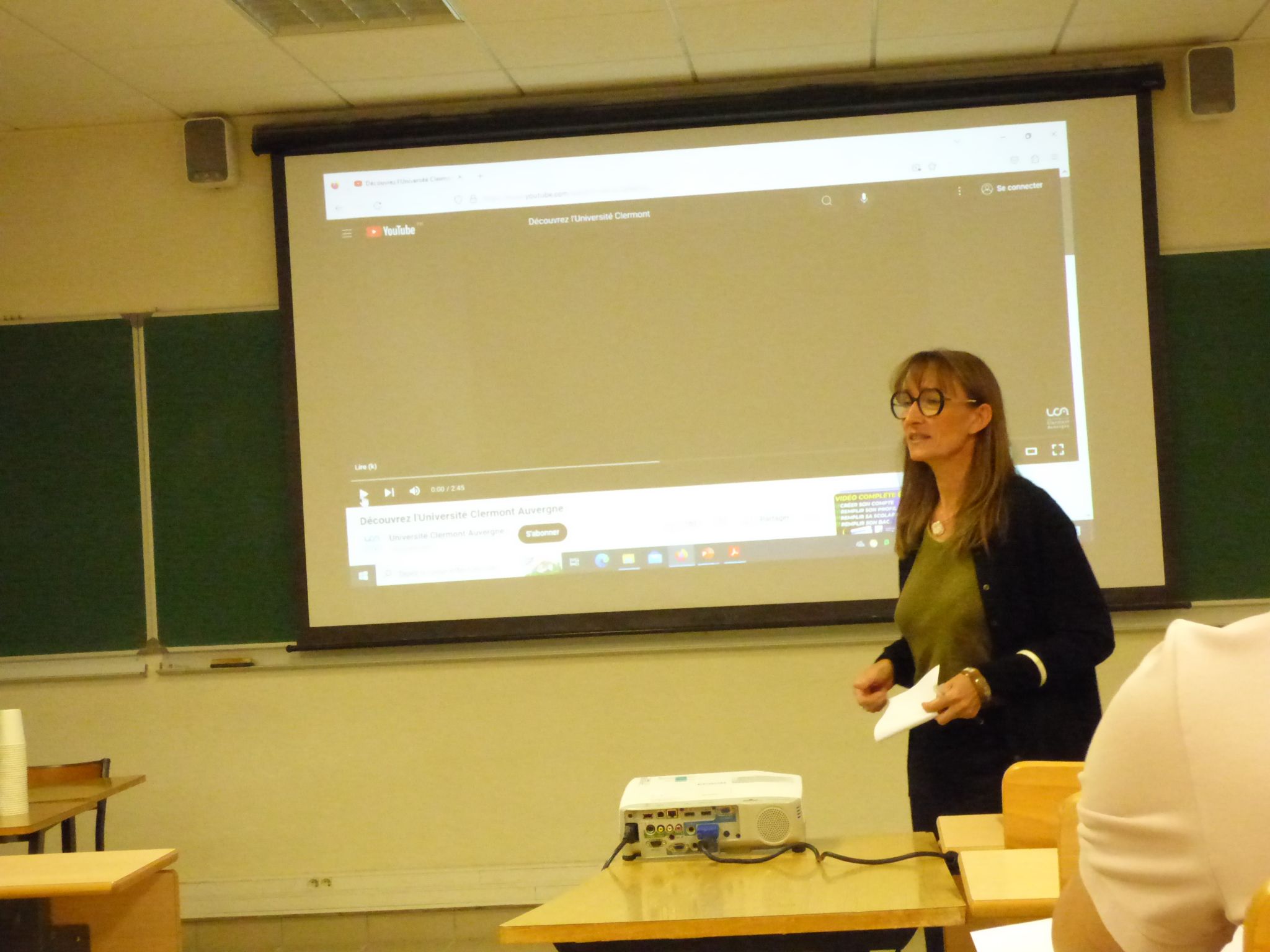副校长V. PREVOT教授对本次活动的成功开展表示感谢。她向我们展示了克莱蒙奥弗涅大学的宣传视频,并介绍了双方长期以来的学术交流合作,对一直以来为双方合作提供支持的学校和有关人员表示感谢。