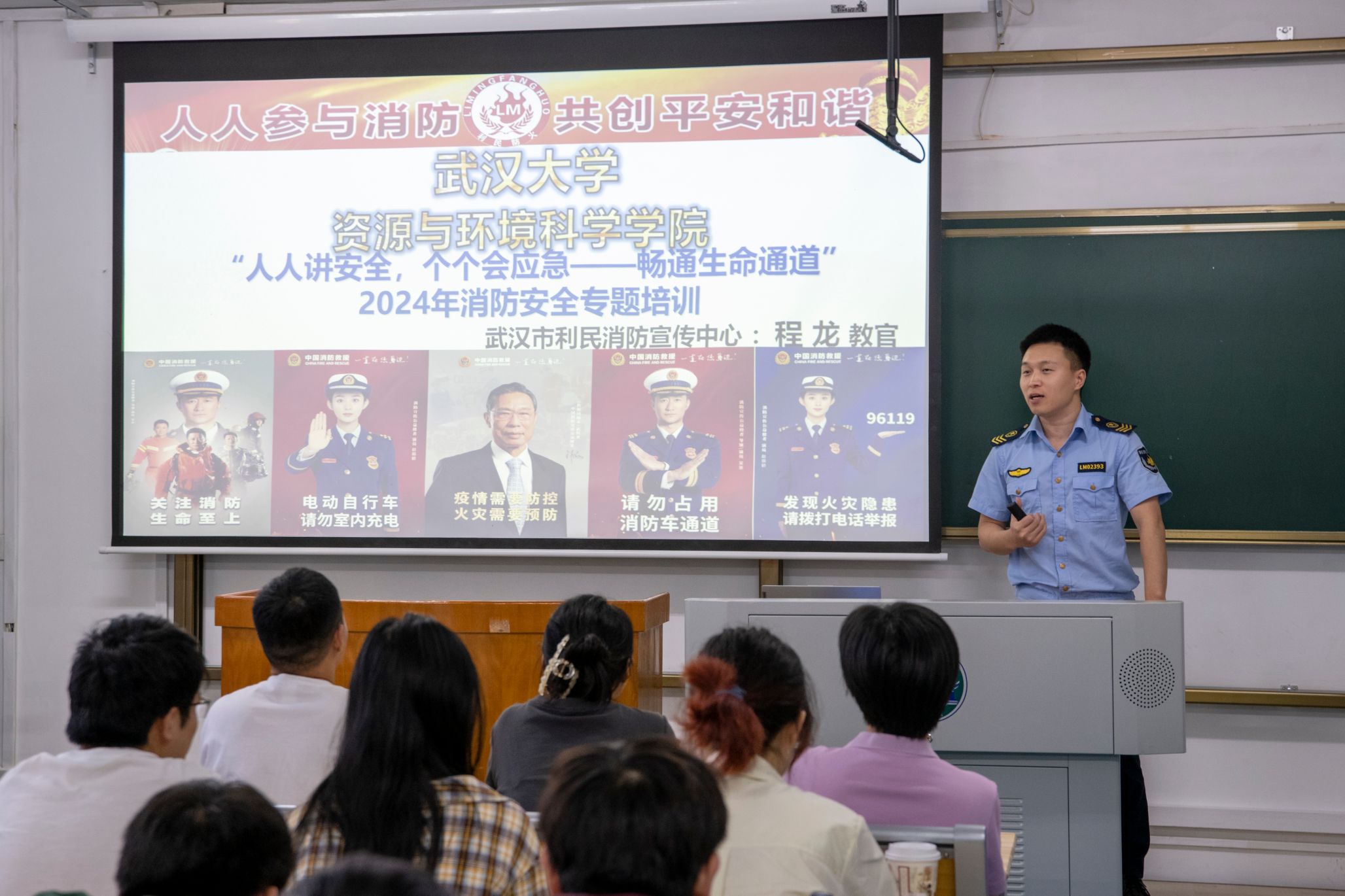 学院还邀请了武汉市利民消防教育中心程龙教官讲授“人人讲安全,个个会应急-畅通生命通道”的报告,程教官用谐音“提拔我呀”让同学们记住干粉灭火器的操作要领,即提灭火筒、拔保险销、手握喷管、压把喷射;向同学们讲授电动车充电、手机充电、使用大功率电器等常见的相关安全知识,以及应急情况下的求生技能等。