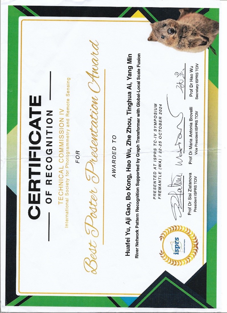 据悉,此次大会是ISPRS的空间信息专委会的两年度学术会议,大会汇聚了来自29个国家和地区的490位学者,共同探讨空间信息科学与技术的前沿进展。余华飞博士的获奖论文针对地图空间模式识别中的不确定性问题,提出了一种融合全局感受野与局部几何特征的图Transformer方法,在复杂河网结构的认知与智能计算应用取得突破,赢得了与会专家的高度评价,并最终荣获最佳论文奖。