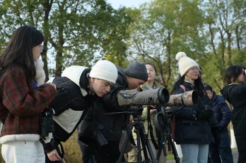 (a)师生合影(b)近观鸟群(c)远观鸟群