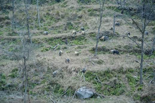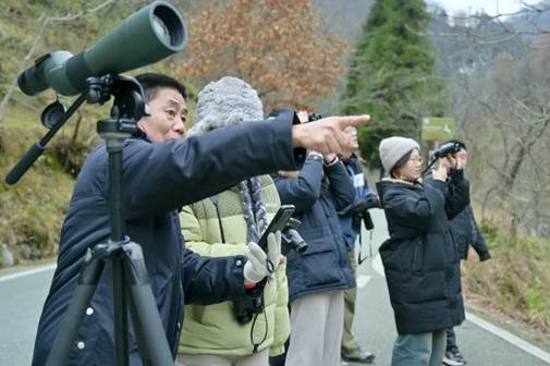 12月21日上午,保护区工作人员马文虎老师向师生们介绍了唐家河的生态环境及主要物种。马老师在保护区工作30多年,多次参与大熊猫样线调查、扭角羚种群和川金丝猴种群等多项调查,曾十余次目击野生大熊猫。他主动申请完成一些位置偏远、条件艰苦的样线,积累了多年野保一线工作经验,形成了一套自己的野生动植物知识体系,练就了一身野外工作的“特殊技能”。随后,师生们在马老师的带领下前往山区深处。在他指引下,一路观测到了大量的野生动物,包括扭角羚、金雕等国家一级保护动物,亲眼观察到他们的行为与栖息环境。马老师介绍了保护区不同动物种群一年四季中的分布区域以及与海拔、气温等因素的关系,指出了保护区周边开矿等人类活动对动物分布的显著影响。