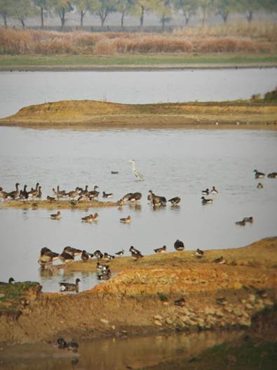 府河湿地已查明有动植物180余种。19日下午,师生们在生态专家的指导下,观察到了国家二级保护动物鸿雁,白琵鹭,小天鹅,花脸鸭,白额雁,以及豆雁,灰雁,赤麻鸭,斑嘴鸭,琵嘴鸭,针尾鸭,绿头鸭,绿翅鸭,绿眉鸭,凤头麦鸡等十余种水鸟。