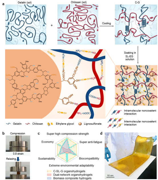 图1. 壳聚糖-木质素磺酸盐-明胶超分子有机水凝胶的构建与优势