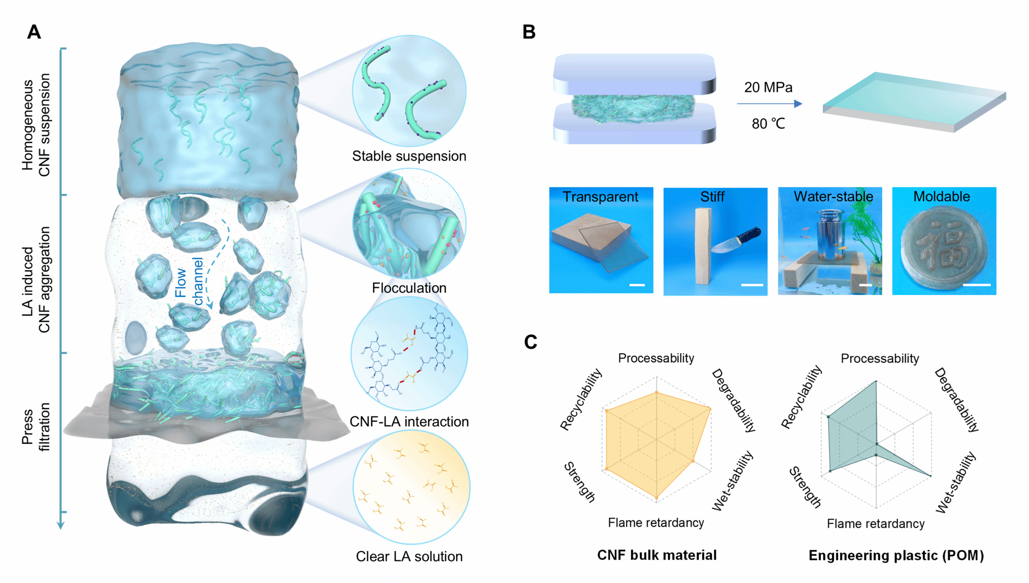 图2. 超分子尺度亲水性调控助力实现纳米纤维素的快速脱水和构筑高性能块体结构材料