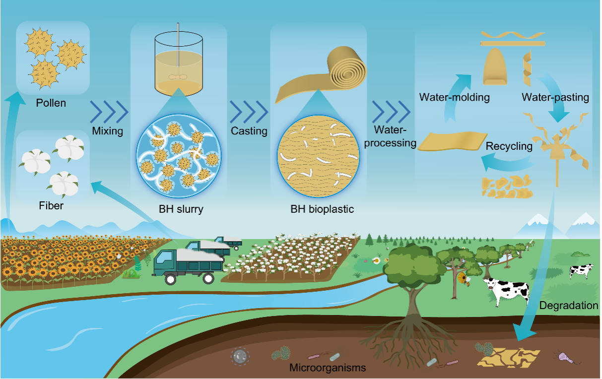 微塑料污染的根源在于不可降解的石油基塑料。因此,团队进一步探索花粉颗粒的结构可塑性与组装潜力,将其与少量预处理后的棉花纤维混合,借助自然干燥过程,全程无需任何有毒化学添加剂或高能耗热压设备,开发出一种具有优异力学性能和环境友好性的新型生物塑料。