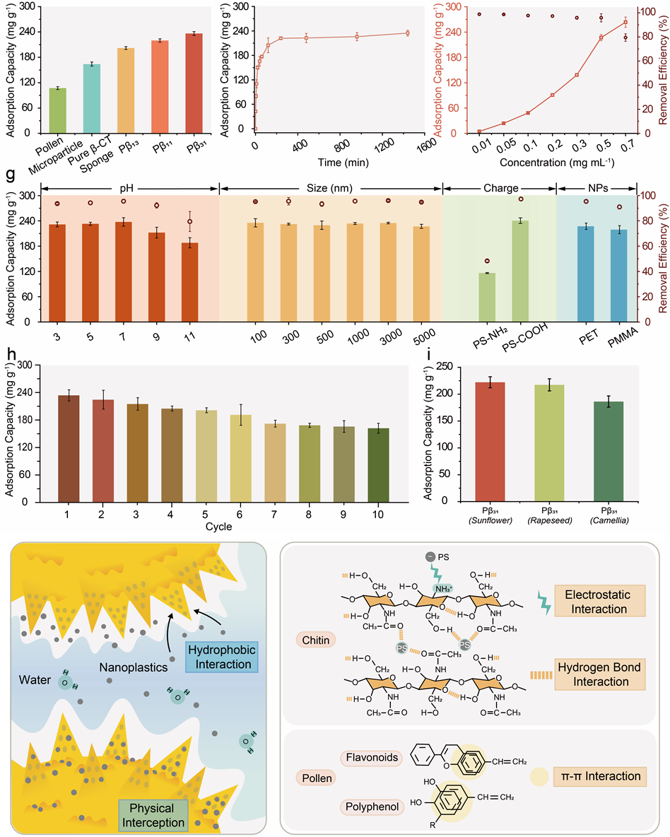 图2. 花粉-甲壳素海绵对纳米塑料的吸附性能与机制