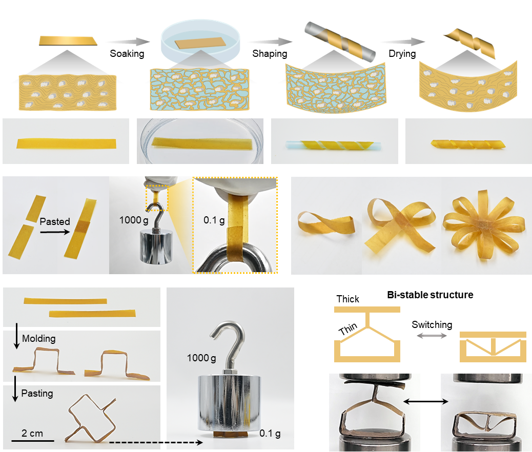 不仅如此,该材料天然具备绿色的“水加工性”,无需复杂分子设计,即可彻底摆脱传统塑料加工对高温或化学粘合剂的依赖。仅凭最常见的水,就能实现材料的多维度塑形、拼接和重复加工:遇水快速软化并灵活塑形,通过水诱导分子界面的解构与重组,即可实现材料之间的无缝拼接,更可反复进行水处理与重构加工,性能始终稳定如初。这种简便、绿色的加工方式为塑料工业的可持续发展开启了全新可能,展现出巨大的应用前景。尤其为个性化定制与复杂结构成型(如包装、医疗器具等)提供了极大的便利,同时有效避免了传统加工方式中高温或化学粘合剂带来的资源浪费与环境风险。