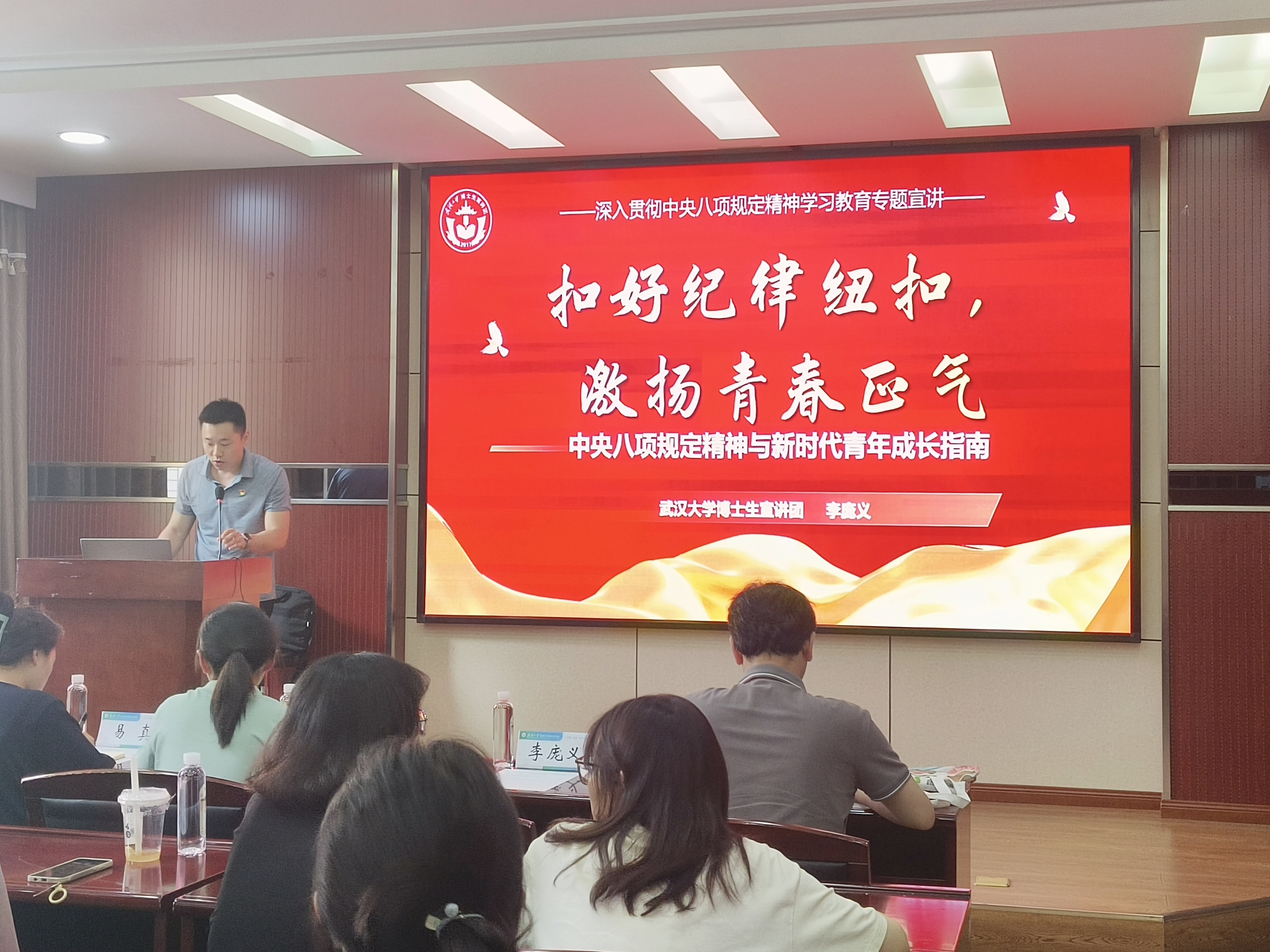 博士生宣讲团讲师、资环学院2024级博士生李庞义同志为大家进行“扣好纪律纽扣,激扬青春正气”深入贯彻中央八项规定精神学习教育主题宣讲。李庞义聚焦中央八项规定精神的核心要义,通过详实的数据和生动的案例就“四风”问题进行了深入剖析,并提出了高校青年党员应“拒浮夸、倡务实,拒躺平、倡担当,拒虚荣、倡简朴”的倡议。最后,李博士祝福所有毕业生党员怀揣理想,更怀揣对底线的坚守,把中央八项规定精神化作人生的压舱石,此去星辰大海,归来仍是清正少年。