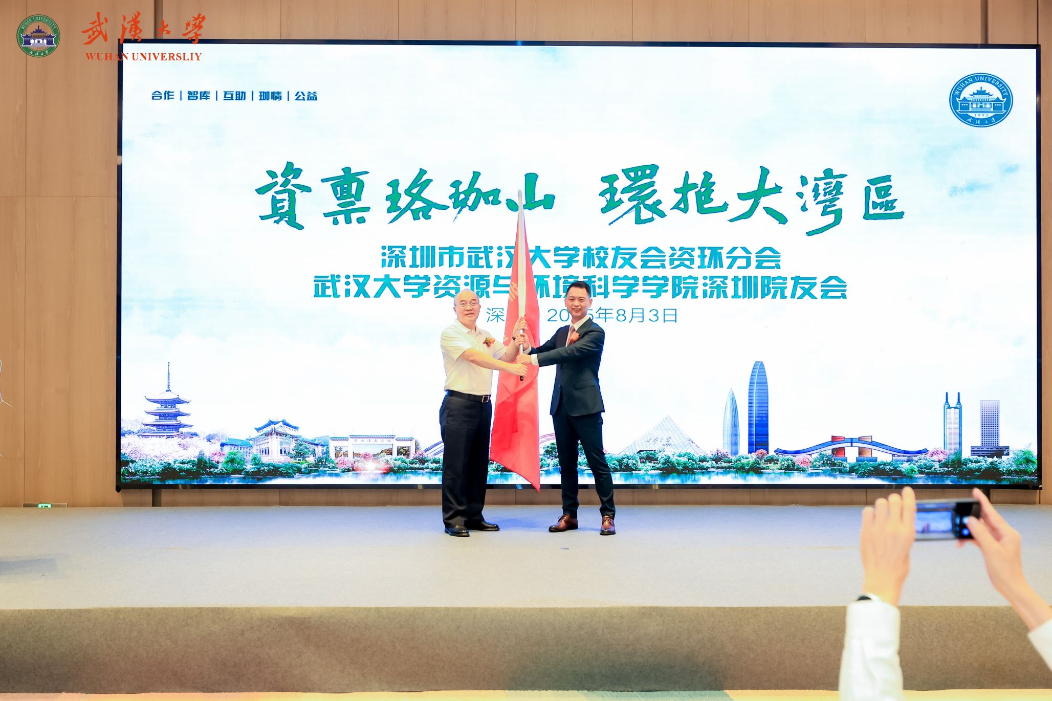 校友会会长刘少雄向分会会长胡晓静授会旗。