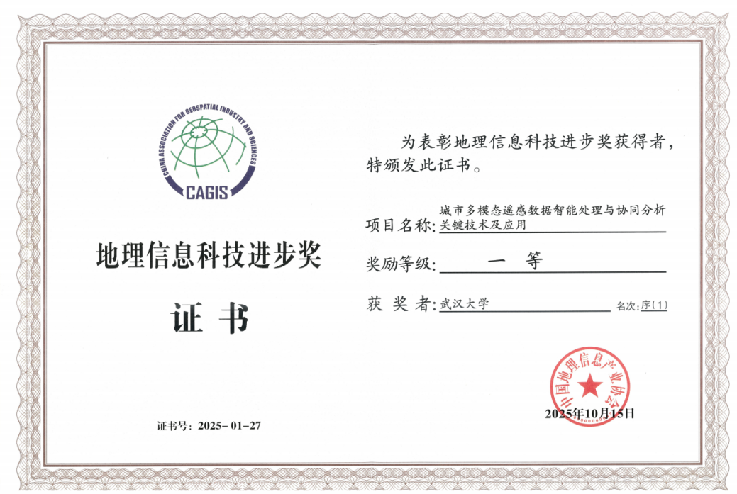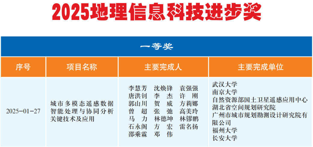 李慧芳教授、沈焕锋教授团队牵头完成的科研项目《城市多模态遥感数据智能处理与协同分析关键技术及应用》被授予2025年地理信息科技进步一等奖。本项目由91沈先生