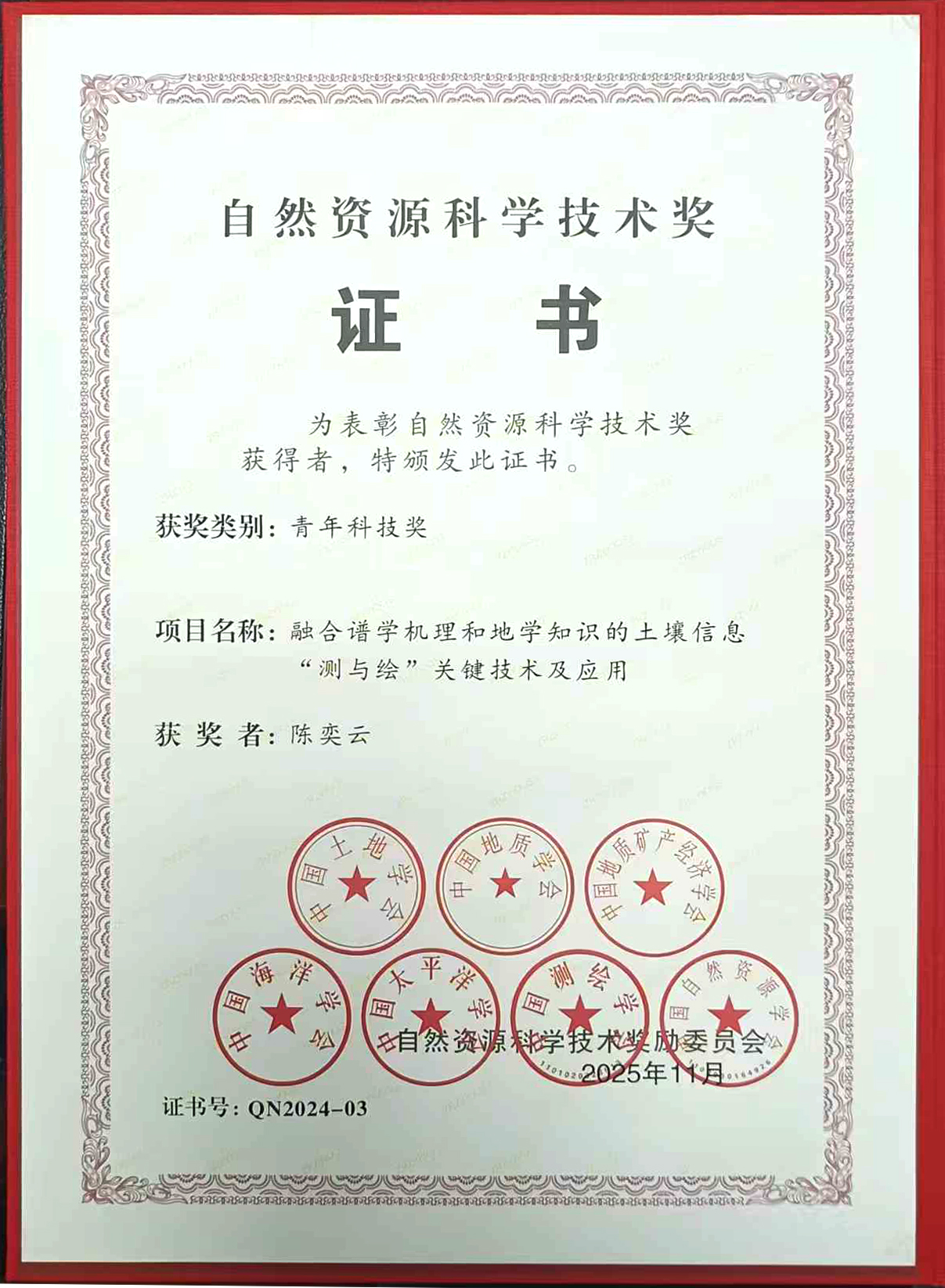 陈奕云教授荣获2024年度自然资源科学技术青年奖,以表彰其在土壤资源调查监测领域的突出贡献。