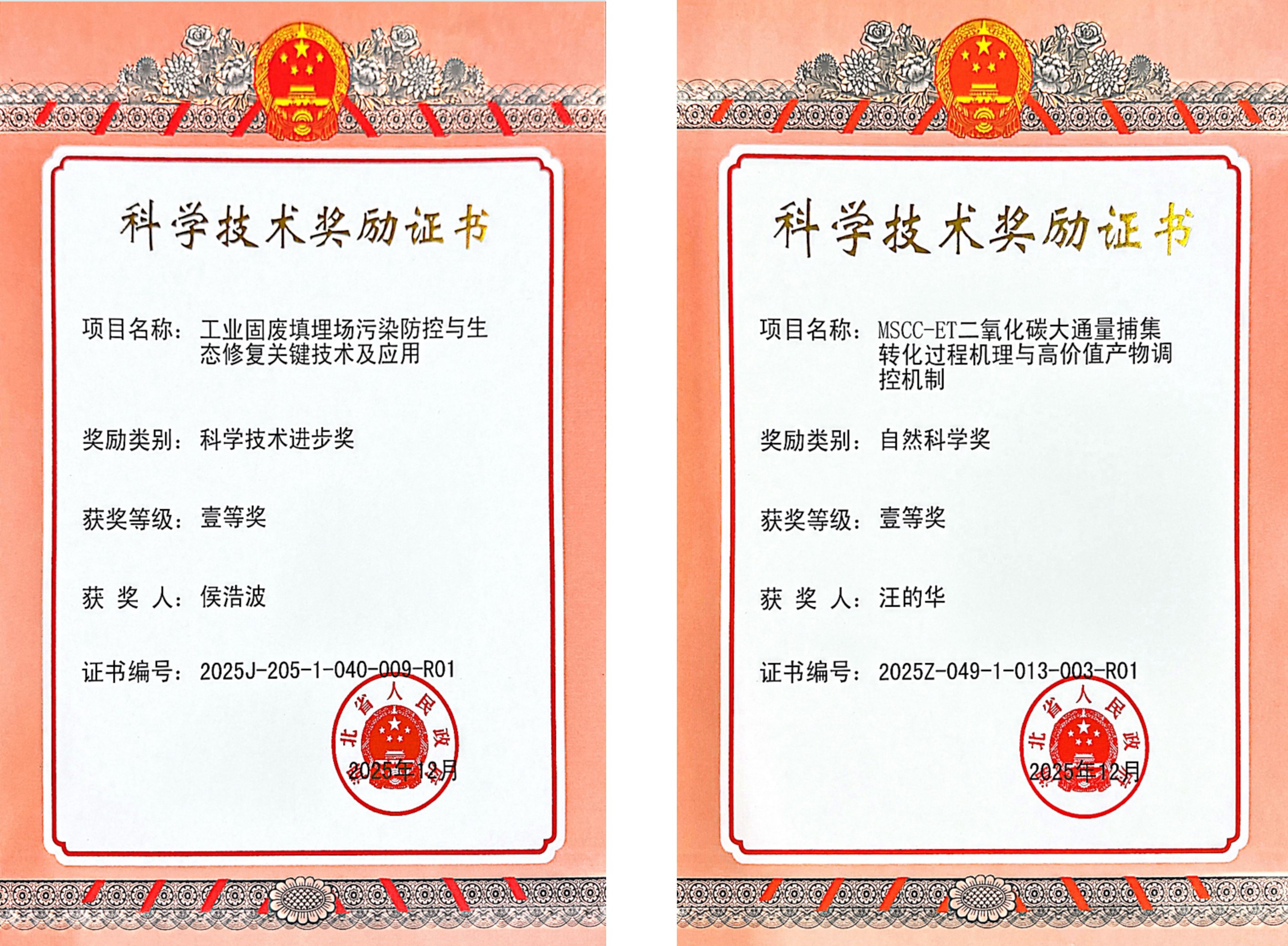 牵头的项目有两项获得一等奖:侯浩波教授团队的“工业固废填埋场污染防控与生态修复关键技术及应用”获得科技进步奖一等奖、汪的华教授团队的“MSCC-ET二氧化碳大通量捕集转化过程机理与高价值产物调控机制”项目获得自然科学奖一等奖。