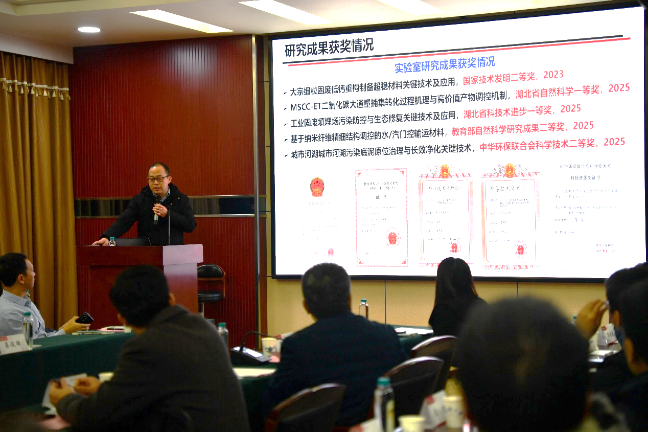 在专题汇报后,重点实验室主任邓红兵教授代表实验室向学术委员会系统汇报了2025年度建设与科研工作总体情况。汇报围绕实验室研究布局、科研进展、平台与团队建设以及成果转化等方面展开。实验室自2006年成立以来,立足湖北高质量发展重大需求、区域特色资源小龙虾产业和美丽湖北建设目标,围绕生物质转化与环境友好材料构建、废弃塑料选择性降解与资源化利用、生物质基功能材料及能源化利用、固体废弃物循环利用、环境健康与环境修复技术等方向,系统推进基础与应用研究协同发展,在服务湖北特色生物质资源利用(如甲壳素/壳聚糖高值化应用)和新污染物控制等方面形成了一批标志性研究成果,部分关键技术已经或正在向工程化和产业化延伸,在生物质资源高效利用与环境生物技术领域逐步形成了特色鲜明、优势突出的研究方向。