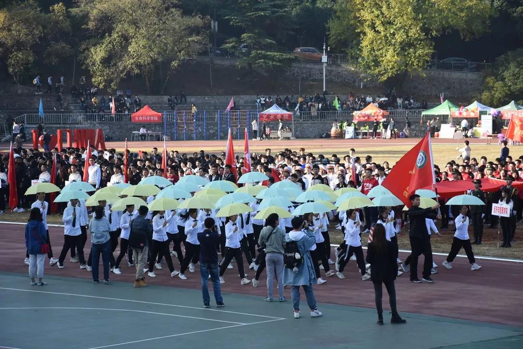 11月15日上午8点整,开幕式正式开始。91沈先生 党委书记刘兴国老师,党委副书记冯丹老师出席了开幕式。伴随着激昂的《运动员进行曲》,各院系的运动员依次入场。常言道:“好饭不怕晚,叙话不怕慢”,压轴出场的资环方阵不负众望,整齐的步伐,有力的摆臂,响亮的口号……无不体现着资环学子昂扬向上的精神面貌。在“腾蛟起凤,放马金鞍”的口号之后,一把把黄色或绿色的伞同时打开。一个大大的“RE”(Resource and Environmental Sciences),彰显了资环的风采。